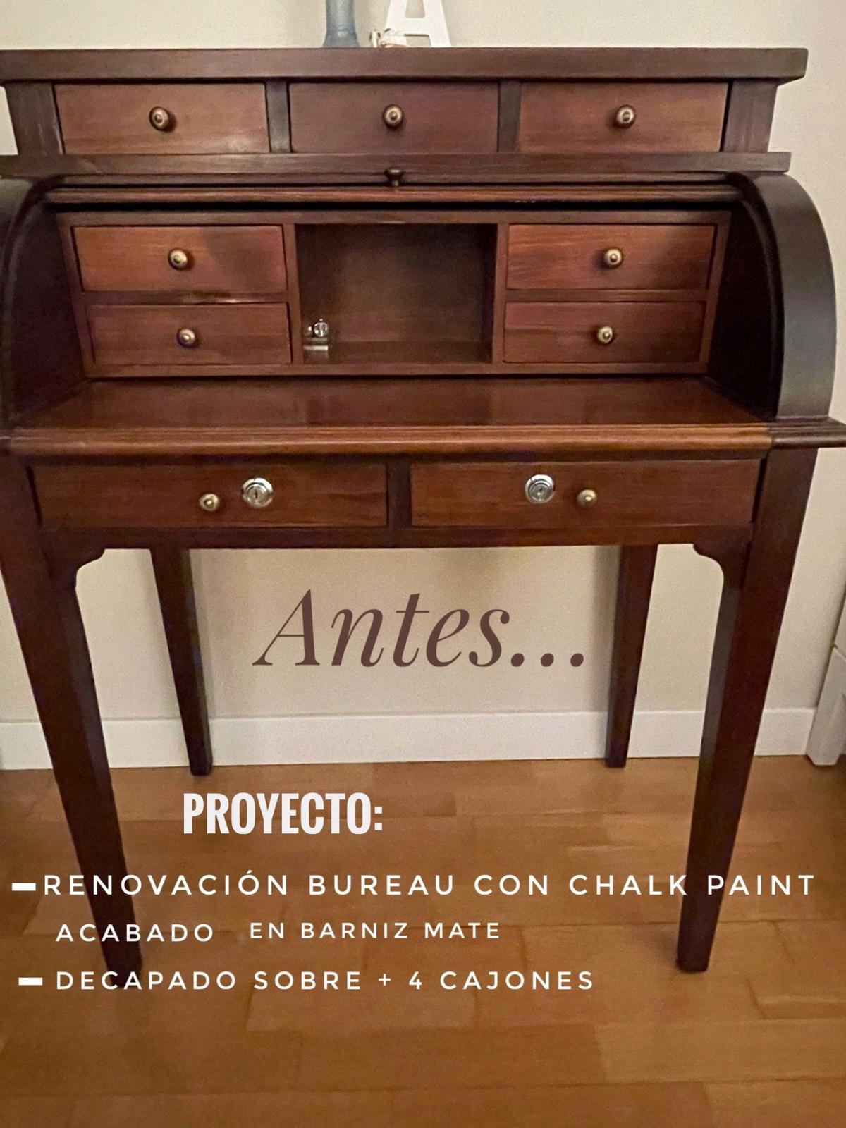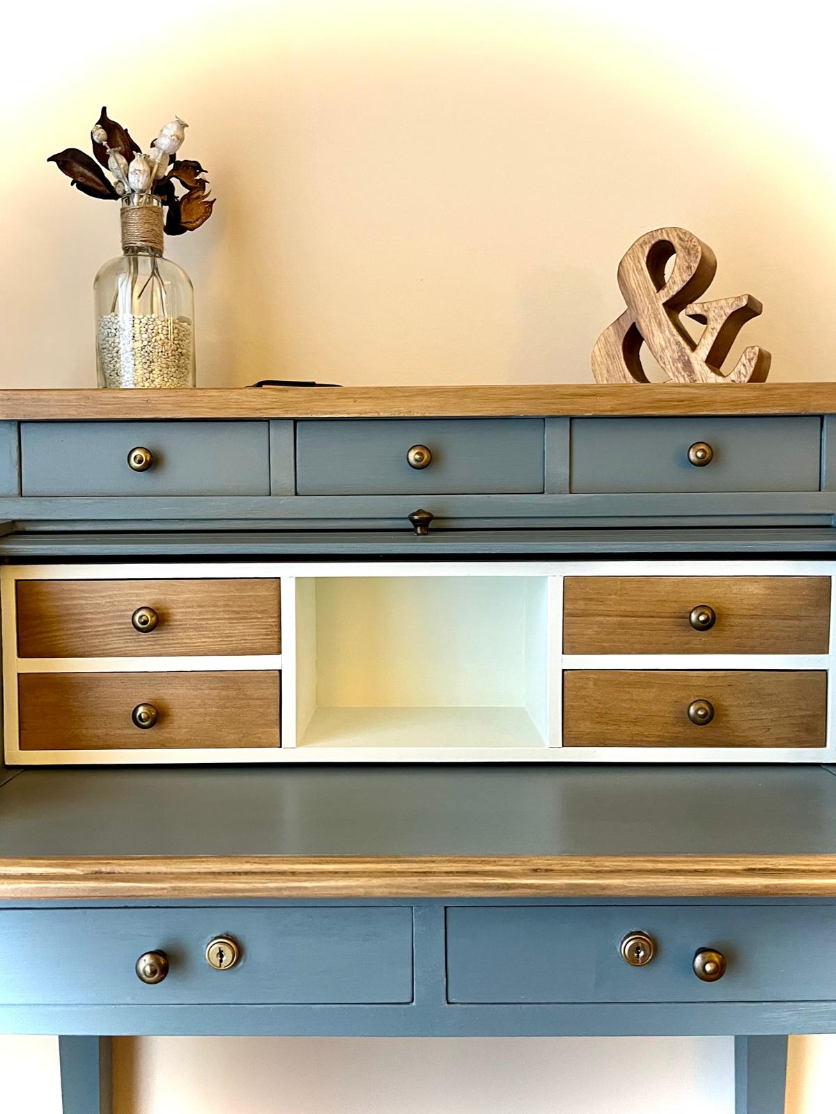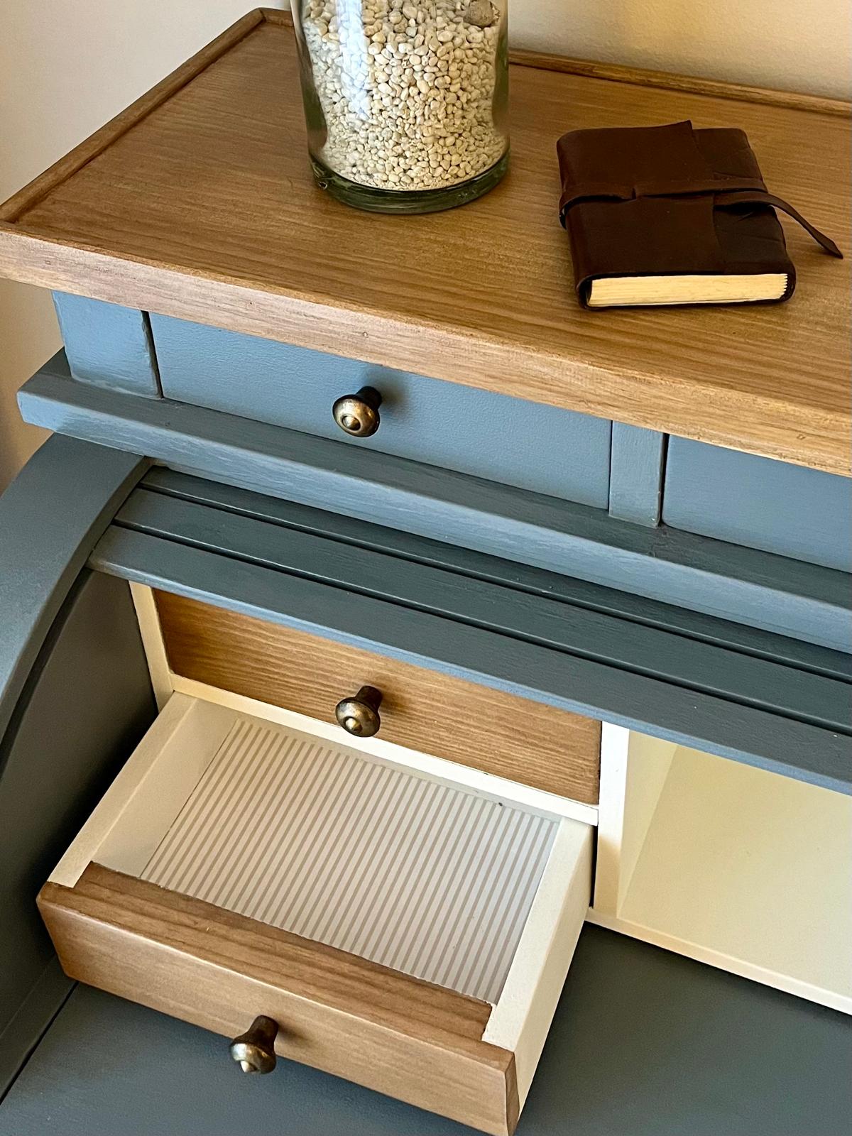 Esta pieza, cargada de valor sentimental, necesitaba un toque único que reflejara la personalidad de su dueño. El color elegido fue un azul vibrante, el favorito de la familia, que le aportó carácter y frescura. Se decaparon el sobre y algunos cajones para resaltar la madera natural, mientras que el interior de los cajones fue completamente renovado y forrado con papel decorativo, añadiendo un detalle elegante y funcional.
