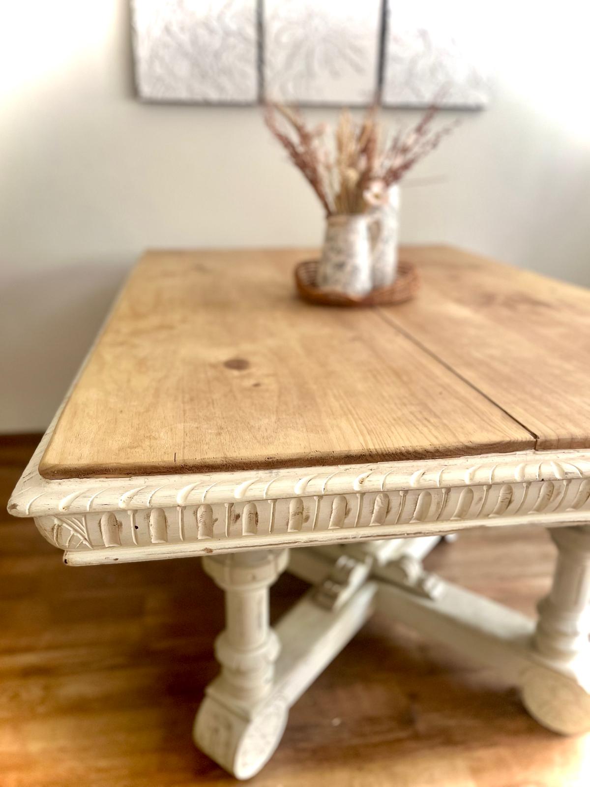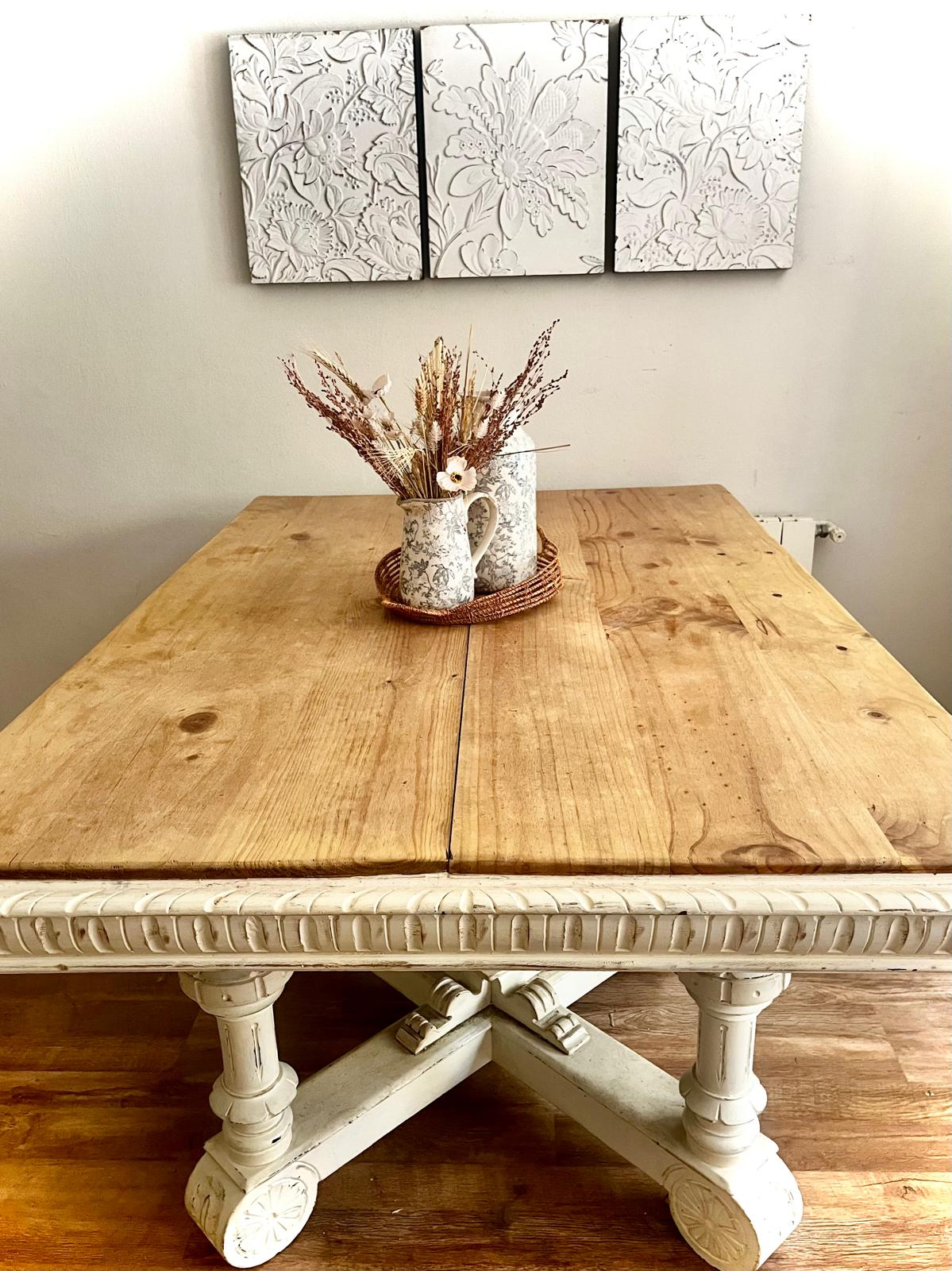 Esta mesa, un valioso legado familiar, tenía un gran significado sentimental. El objetivo era combinar un estilo sobrio con la belleza de la madera natural de pino. Para lograrlo, realicé un acabado envejecido utilizando chalk paint, que resalta la textura de la madera y aporta un aire sofisticado y atemporal, manteniendo su esencia original y dándole una nueva vida.
